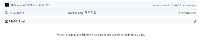 파일이 잘 커밋이 되었지만, contain binary data 때문에 화면에 표시할 수 없다고 나옵니다. 이런경우 해당 파일을 클릭하여 쓰레기통 아이콘을 누르면 파일을 삭제할 수 있다.