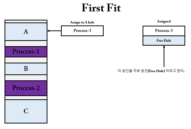 가변 분할에서 일반적으로 메모리는 다양한 크기 공간(hole)들이 존재한다. 프로세스가 공간(hole)을 필요로 할 때 운영체제는 이 공간들 중 적절한 것을 찾아내야 한다.