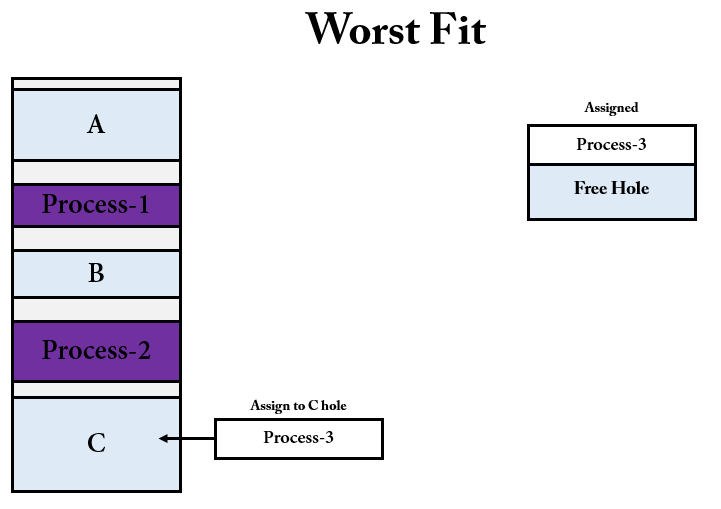 - 최악 적합의 아이디어는 할당해주고 남은 자유 공간(free hole)은 충분히 커서 다른 프로세스들의 위해서 유용하게 사용될 수 있다는 것이다.