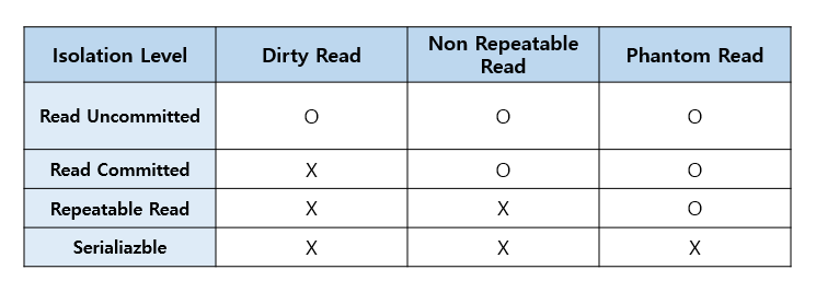 - ReadUncommitted 로 갈 수록 동시성은 높아지고, 일관성은 떨어진다.