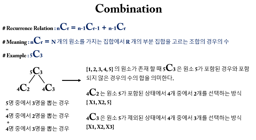 nCr 은 n 개의 원소를 갖는 집합에서 r 개의 부분 집합을 고르는 경우의 수를 의미하므로 부분 집합과도 관련이 있다.
