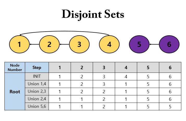 서로소 집합(Disjoint Sets)은 공통 원소가 없는 두 집합을 의미한다. 예를 들면 {1, 2}와 {3, 4} 가 서로소 집합에 해당된다.