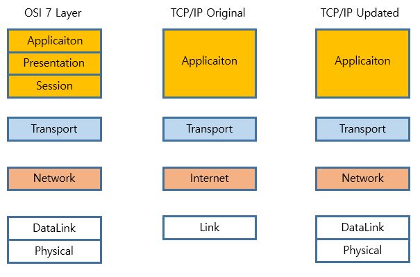 OSI 7 Layer 의 5,6,7 계층이 Application Layer 하나로 통합되었다. 1,2 게층이 Network Interface 로 통합되었다.