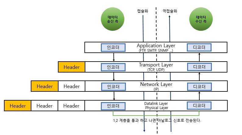 - 송신자 쪽에서 상위 계층에서 하위 계층으로 데이터를 보낼 때, 각 계층의 인코더를 통해 데이터를 캡슐화 하며, 1-2 계층을 통과하면 아날로그 신호로 바뀌어 전선을 타고 수신자 측의 하위 계층 디코더로 진입한다. 송신자 쪽에서 데이터를 보내면서 헤더가 추가되는 과정을 캡슐화라고하며, 수신자 쪽에서 캡슐화된 헤더를 벗겨내는 과정이 역캡슐화라고 한다.